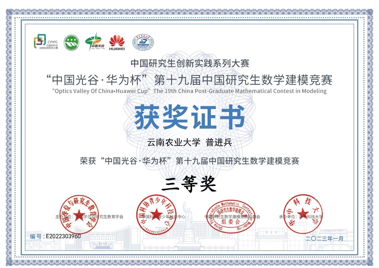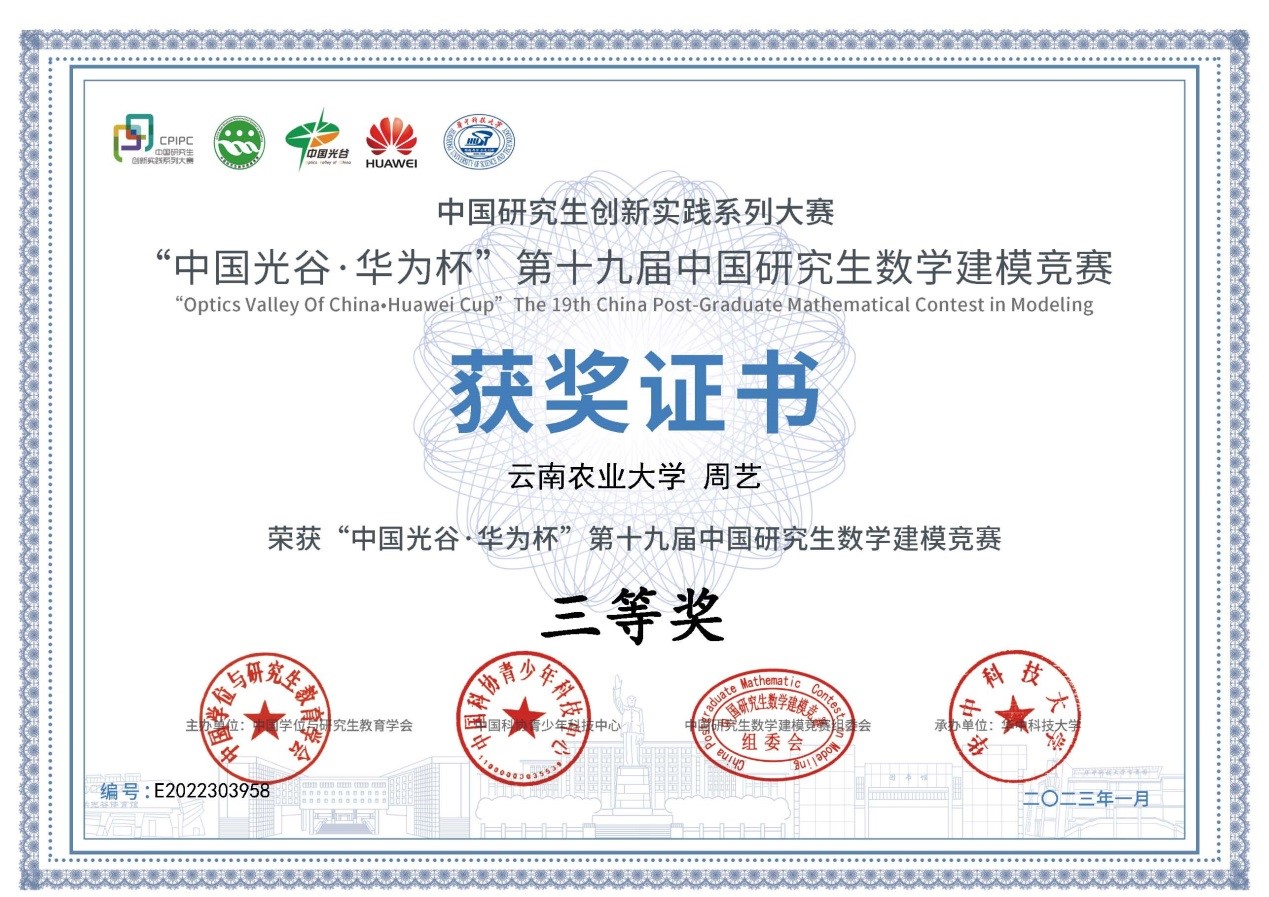 2023年1月,中国研究生数学建模竞赛组委会发布了2022年“中国光谷·华为杯” 第十九届中国老员工数学建模竞赛获奖名单,并颁发了获奖证书。