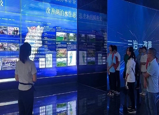 24日上午团队成员在抚仙湖管理局相关技术人员陪同下首先参观了澄江市规划馆。规划馆以习近平生态文明思想在澄江的生态实践为主题,以抚仙湖和绿色发展为主线,通过5个不同单元,采用沉浸式体验、造型墙、实物展示、数字影片等方式,展现澄江市近年来在生态环保、城市建设和产业结构调整方面所做的各项重点工作和取得的成效。在聆听了规划馆讲解员的介绍后,团队成员对抚仙湖保护的历程及近几年实施的一些举措有了初步的了解。