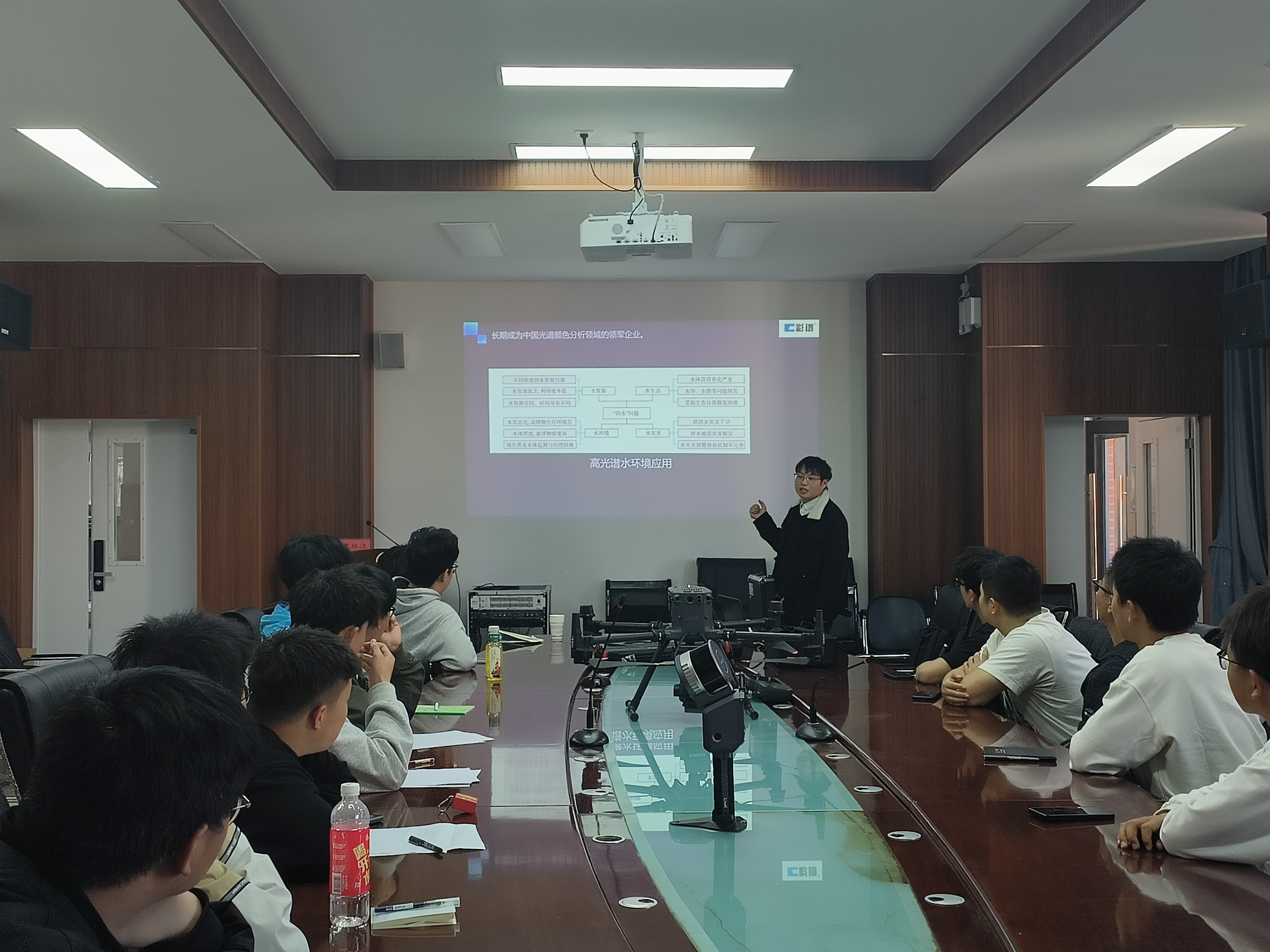 本次交流活动主要以介绍无人机搭载高光谱相机对水体、植物、土壤等地物进行光谱图像信息采集,应用于精准农业、湖泊与流域环境监测等,与公司员工所学专业有极好的契合度。侯金涛老师详细讲解了高光谱相机的技术原理和应用方向,并且带来了最新的M350RTK型号无人机,搭载了高光谱测量系统FS-62,为同学们做了实操演示。王庆老师与专家们进行了技术交流。