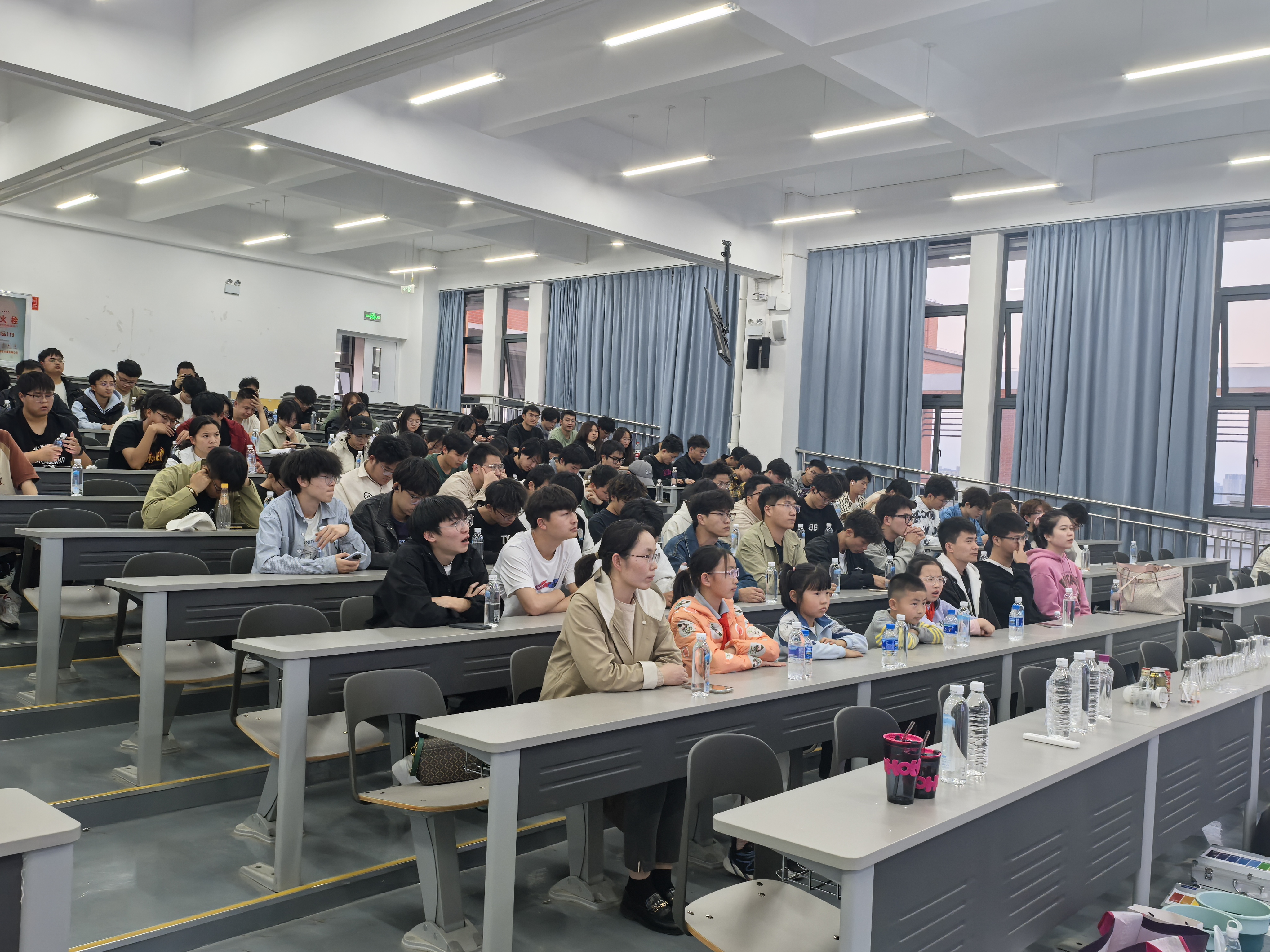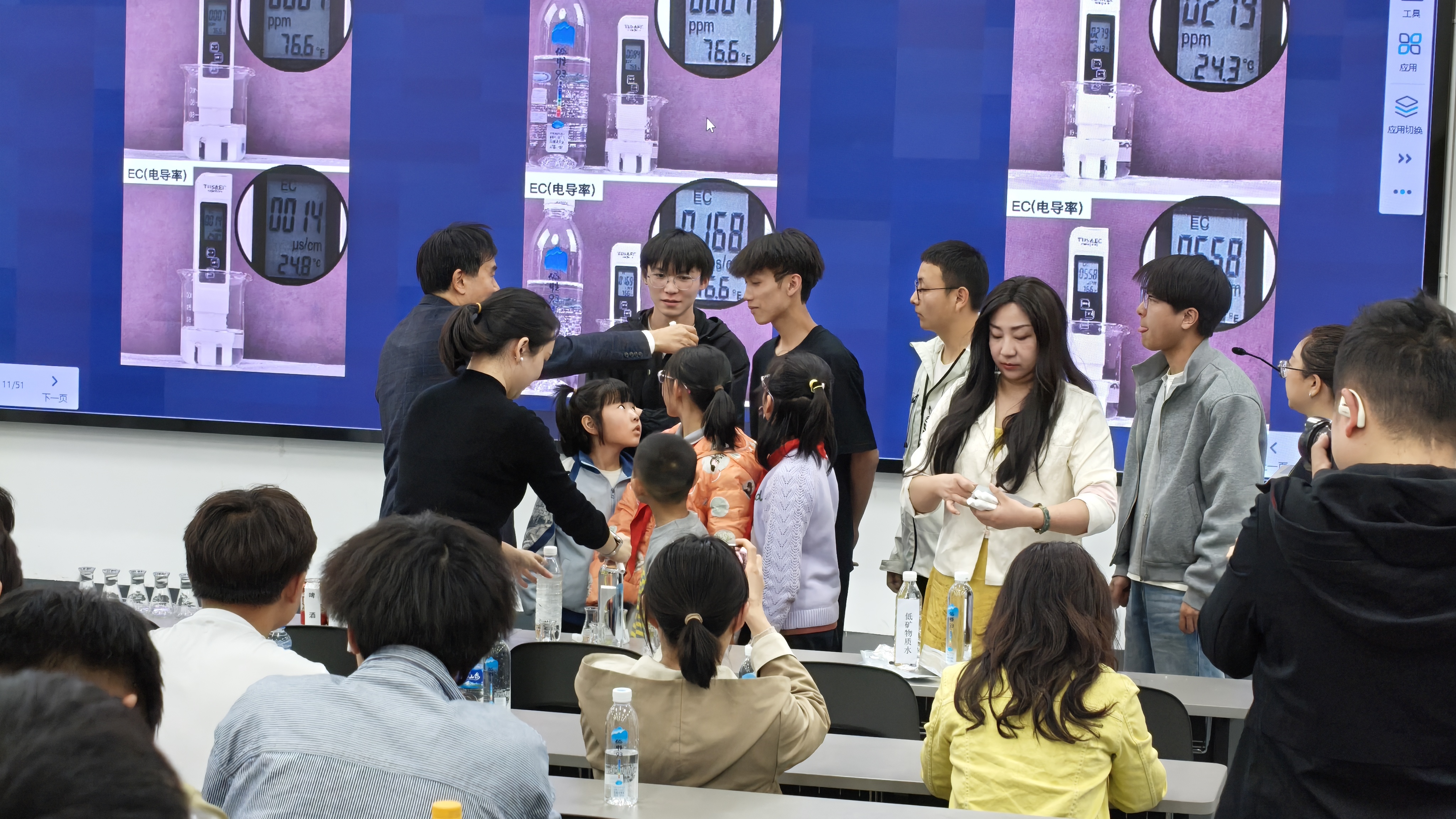 王忠董事长以《饮用水与人体健康》为主题,深入分析阐述了全球水源污染现状、中国水源地分布现状及饮水安全对人民群众的重要性,现场还邀请员工参与生动的实验,进一步向师生们展示了饮水安全及水健康的